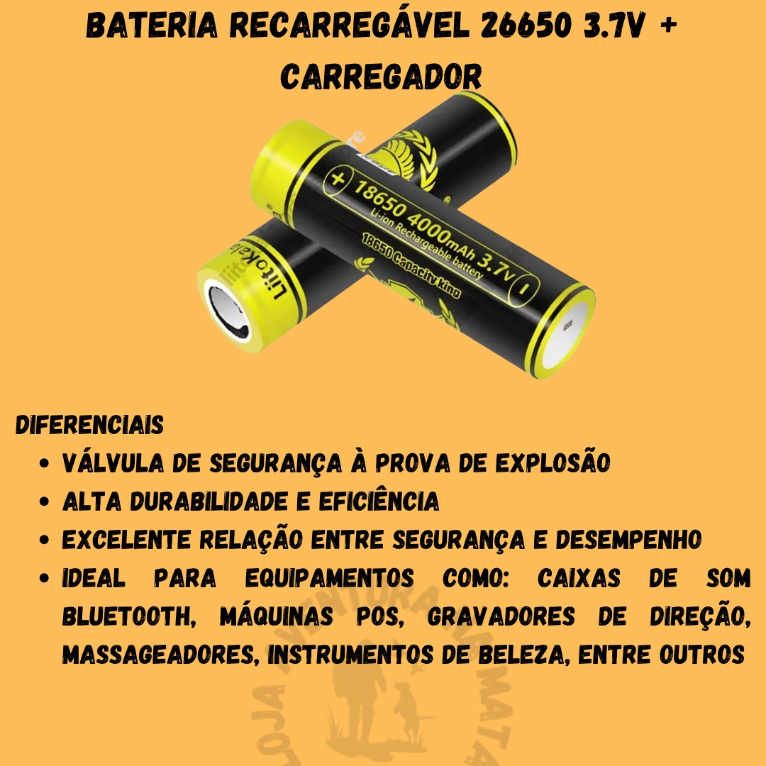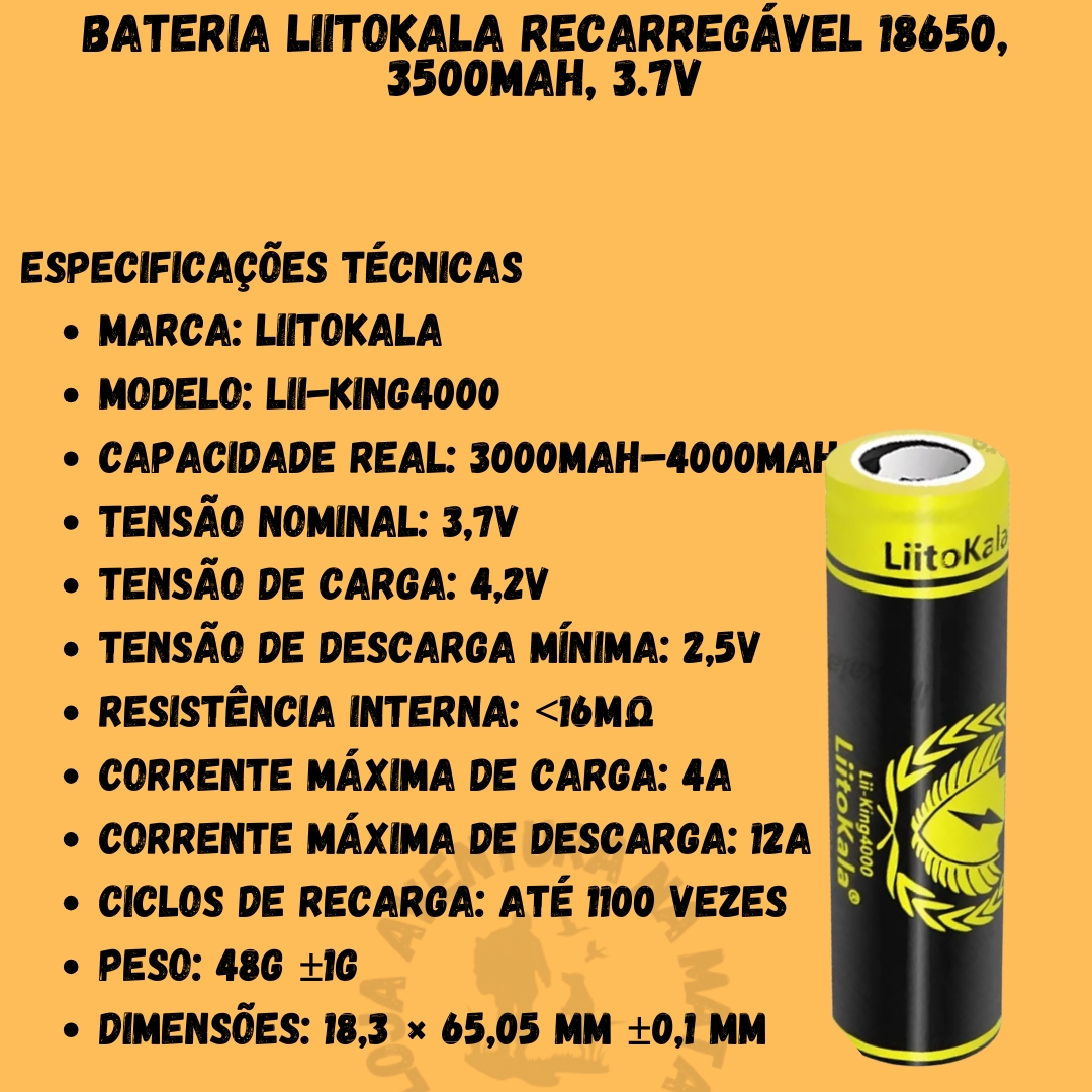 A LiitoKala 18650 – 4000mAh é uma bateria de lítio recarregável de alta performance, ideal para quem busca durabilidade, segurança e confiabilidade. Compatível com diversos equipamentos eletrônicos, oferece longa vida útil e proteção contra sobrecarga, descarga excessiva e superaquecimento.