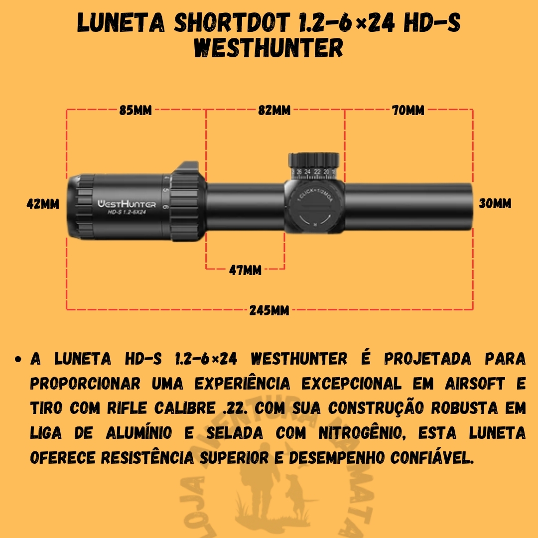 Projetada para airsoft e rifles calibre .22, a WestHunter HD-S 1.2-6x24 é uma luneta compacta e robusta, fabricada em liga de alumínio e selada com nitrogênio, garantindo resistência a choque, água e embaçamento.