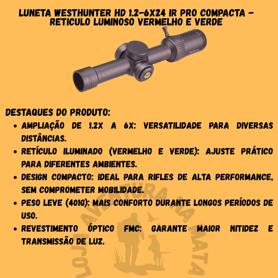 A Luneta WestHunter HD 1.2-6X24 IR Compacta é ideal para caçadores e atiradores que precisam de visibilidade e desempenho em qualquer condição de luz. Com seu retículo iluminado vermelho e verde, oferece visão clara tanto em ambientes iluminados quanto escuros, sem abrir mão da leveza e do design tático.