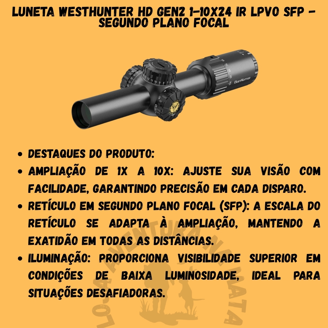 A Luneta WestHunter HD Gen2 1-10X24 IR LPVO SFP é ideal para caçadores e atiradores que exigem um equipamento de alta performance em diversas situações. Com tecnologia de ponta e uma construção robusta, esta luneta se destaca em qualquer condição de tiro, proporcionando uma experiência incomparável.