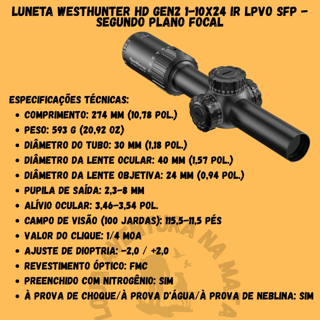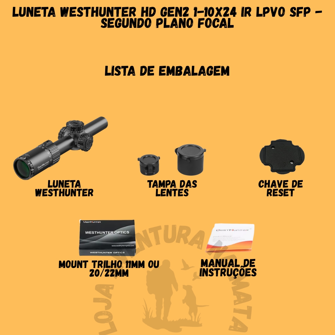 📦 Na Embalagem: 1 Luneta WestHunter HD Gen2 1-10X24 IR LPVO SFP, tampas protetoras de lente, manual do usuário.