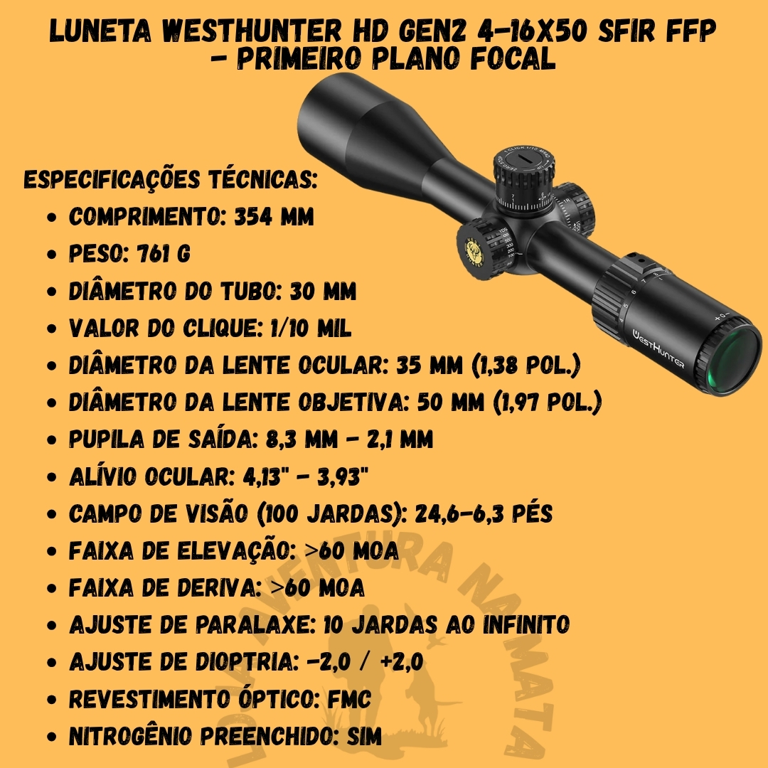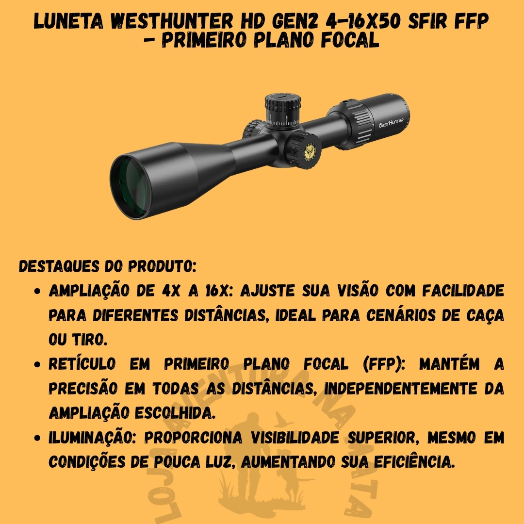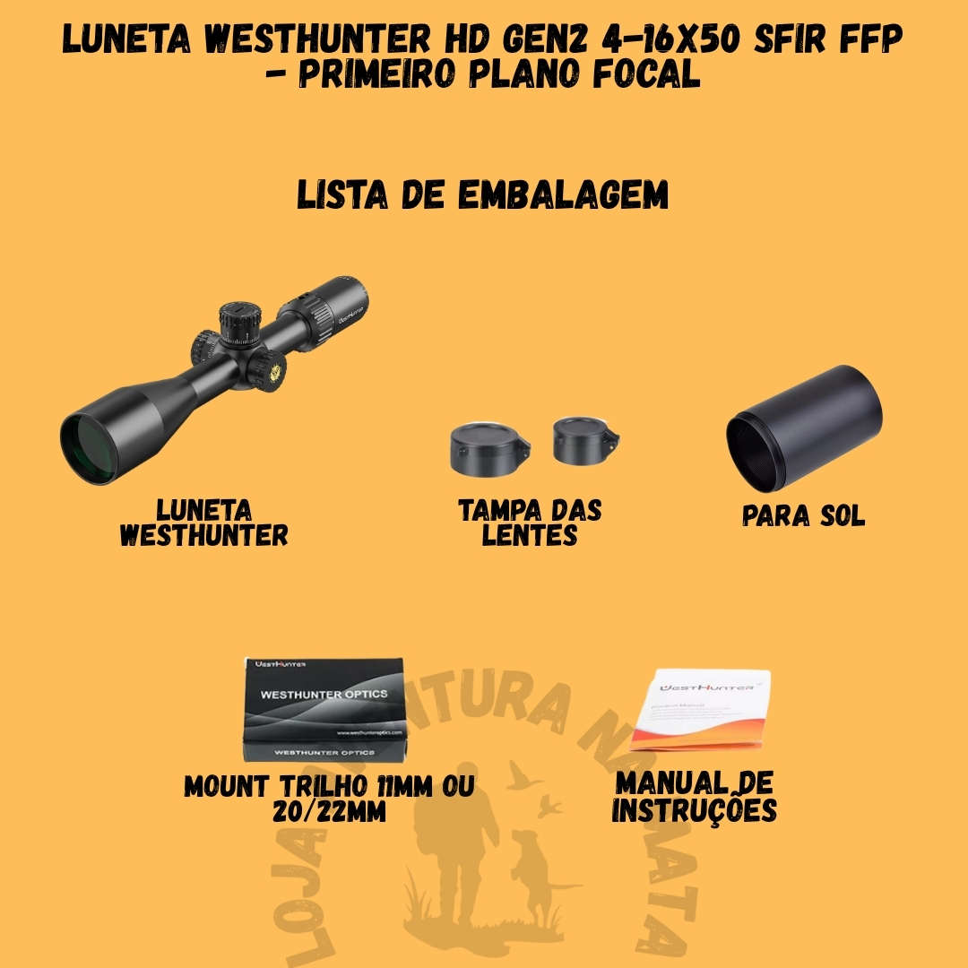 📦 Na Embalagem: 1 Luneta WESTHUNTER HD GEN2 4-16X50 SFIR FFP, tampas protetoras de lente, manual do usuário.
