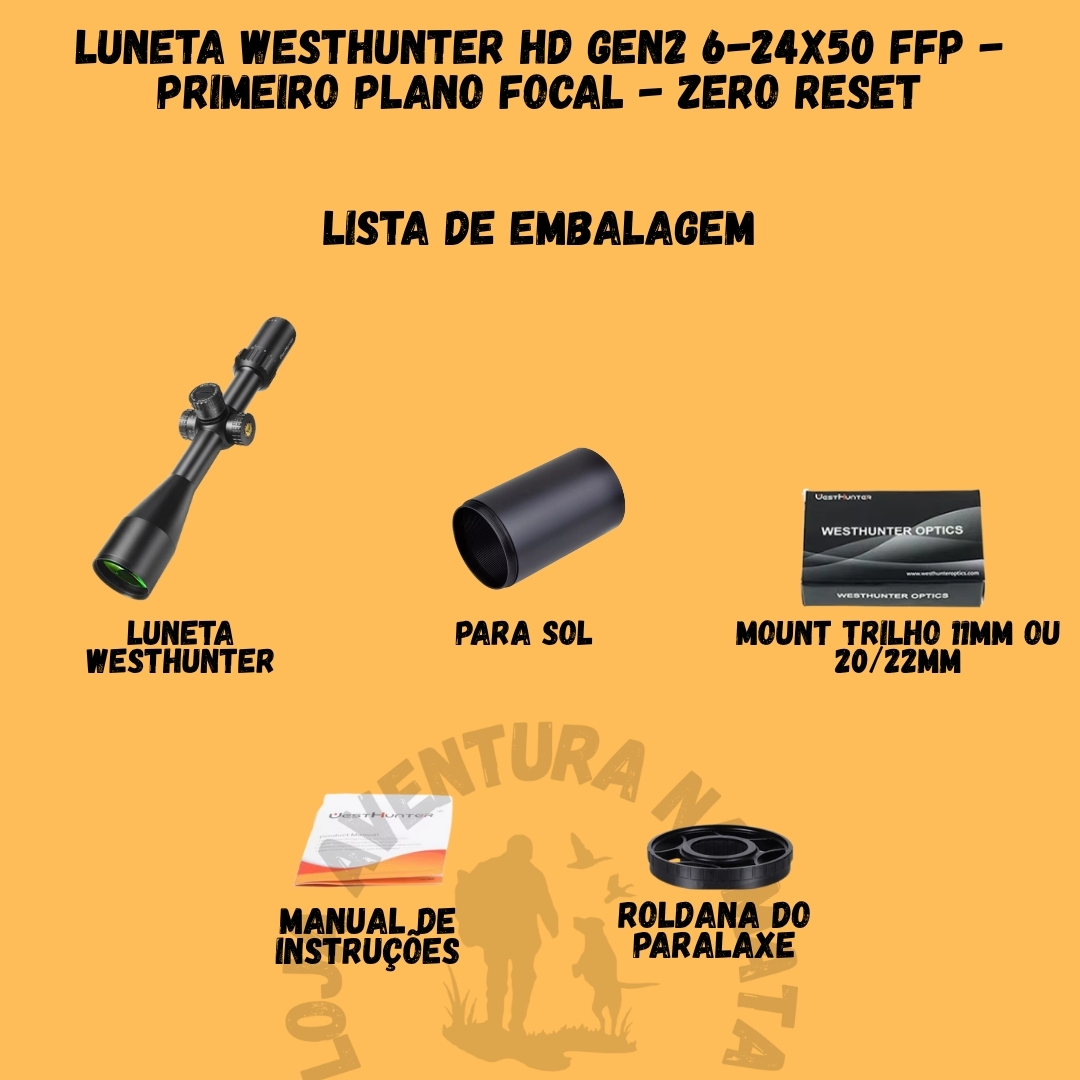 📦 Na Embalagem: 1 Luneta WestHunter HD Gen2 6-24x50 FFP Tampas protetoras de lente Manual do usuário