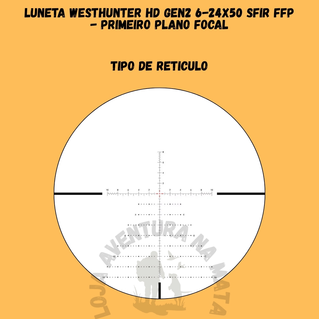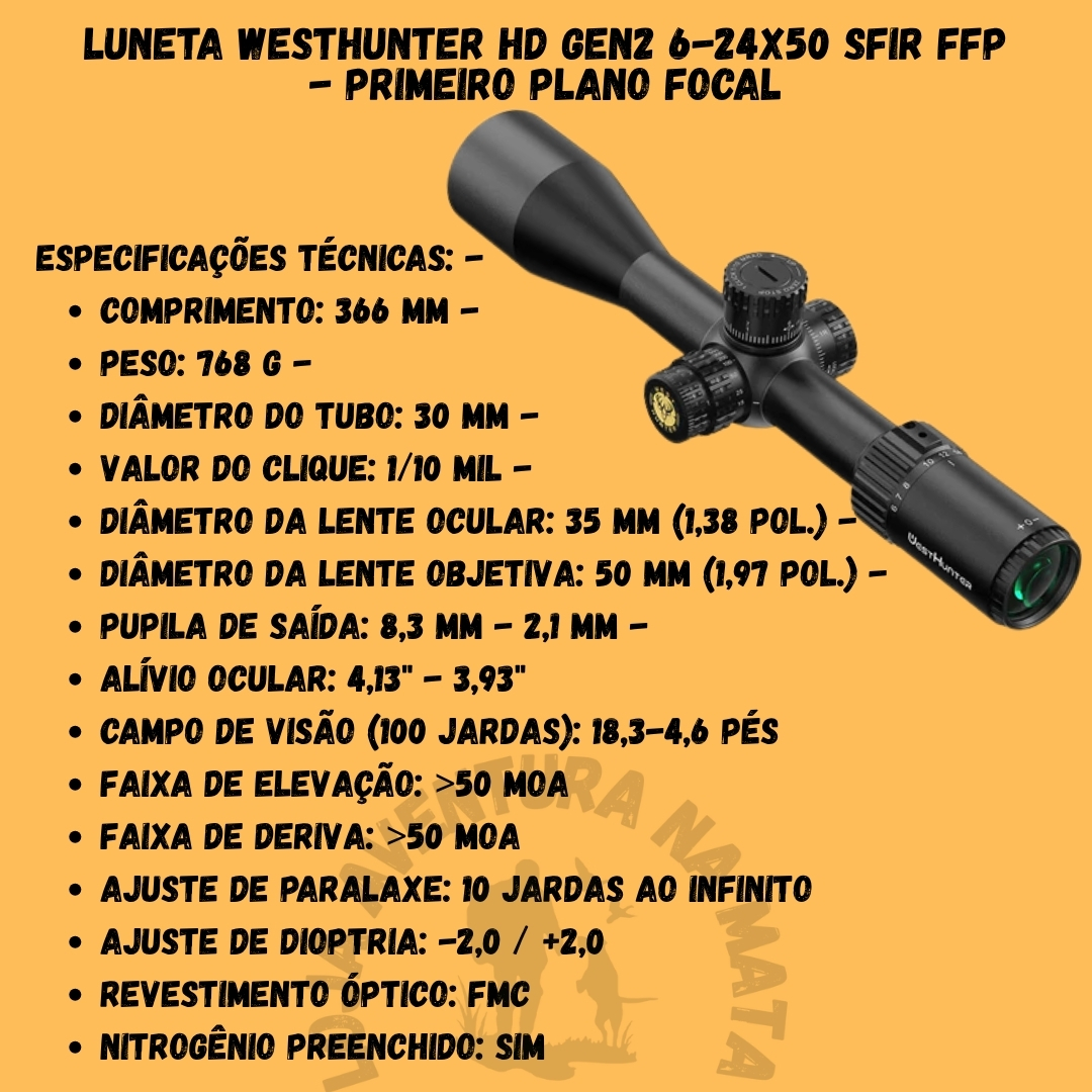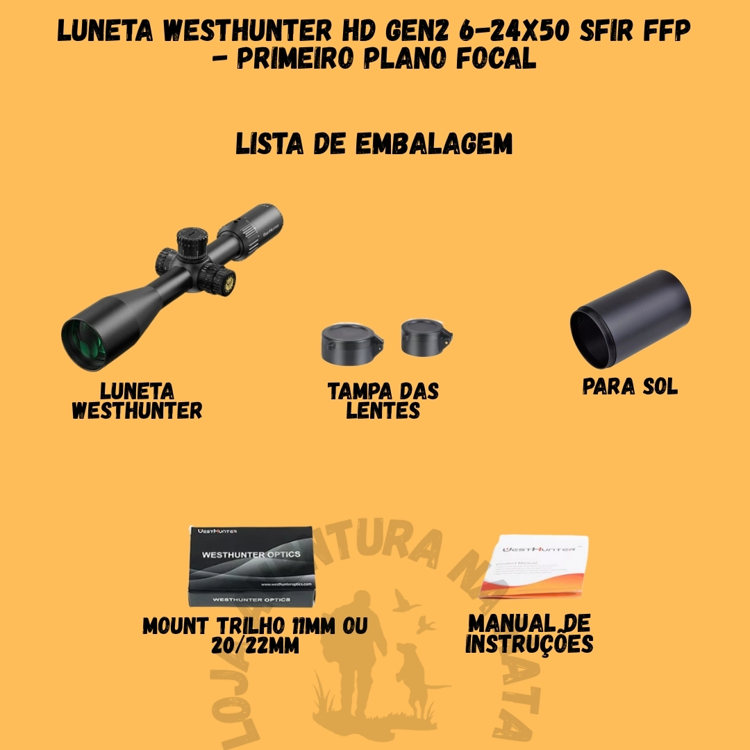 📦 Na Embalagem: 1 Luneta WESTHUNTER HD GEN2 6-24X50 SFIR FFP, tampas protetoras de lente, manual do usuário.
