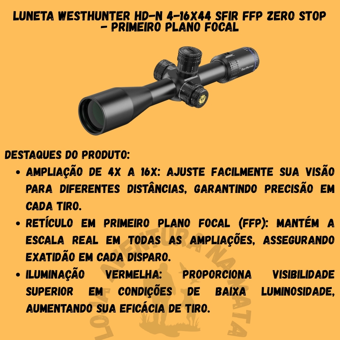 A Luneta WestHunter HD-N 4-16X44 SFIR FFP foi projetada para atender caçadores e atiradores que buscam um equipamento de alta performance em diferentes condições de luz e distâncias. Com uma ampliação versátil e tecnologia de ponta, você terá a confiança necessária para cada disparo.
