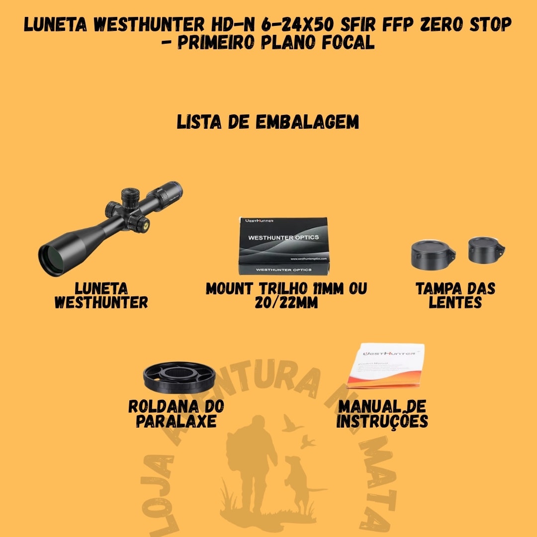 📦 Na Embalagem: 1 Luneta WestHunter HD-N 6-24X50 SFIR FFP Tampas protetoras de lente Manual do usuário