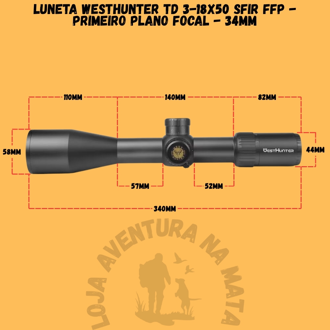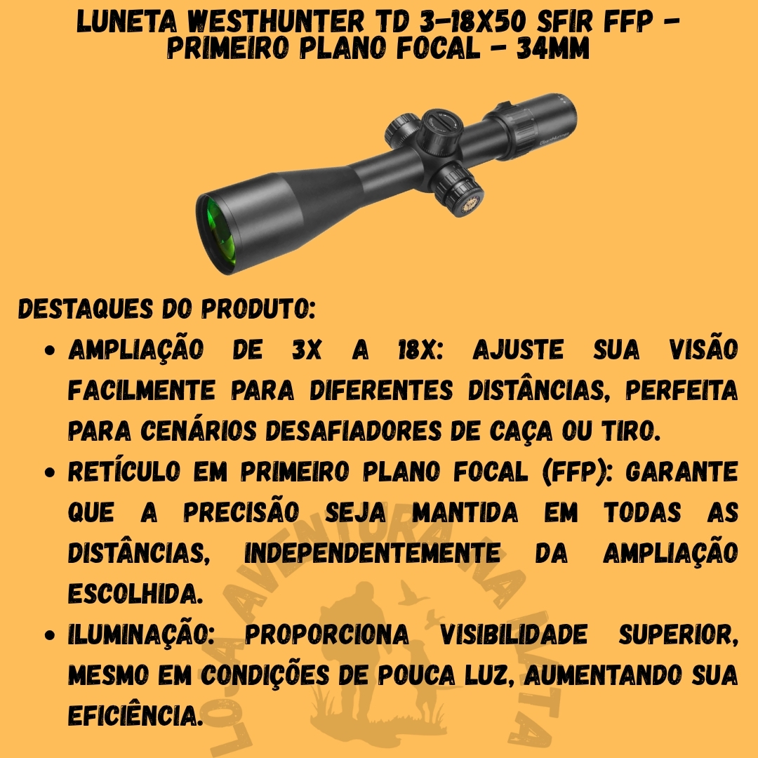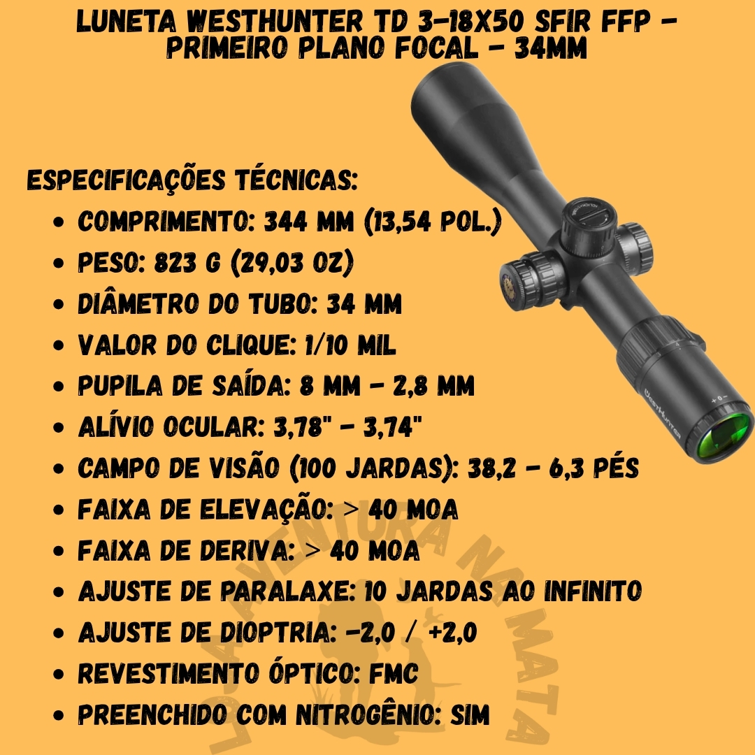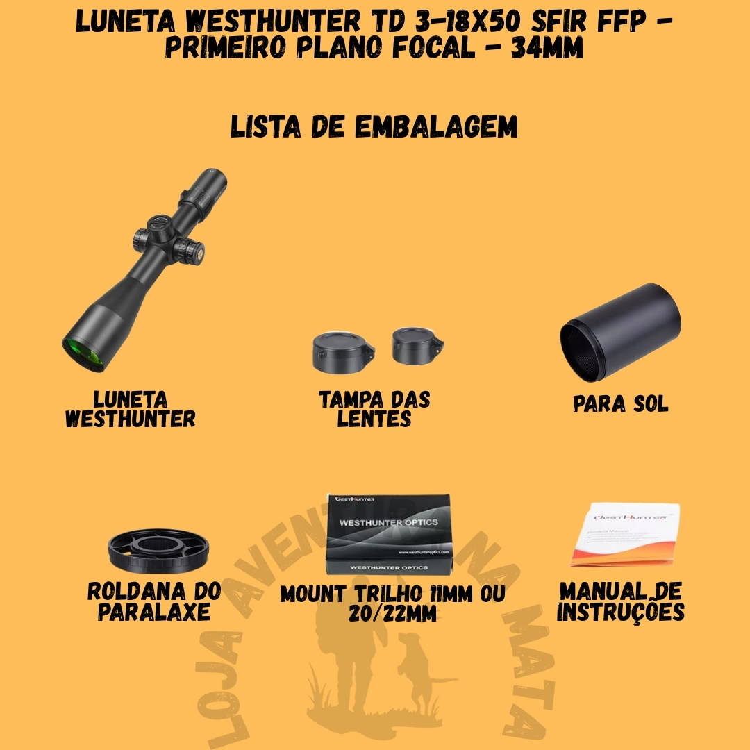 📦 Na Embalagem: 1 Luneta WESTHUNTER TD 3-18X50 SFIR FFP, tampas protetoras de lente, manual do usuário.