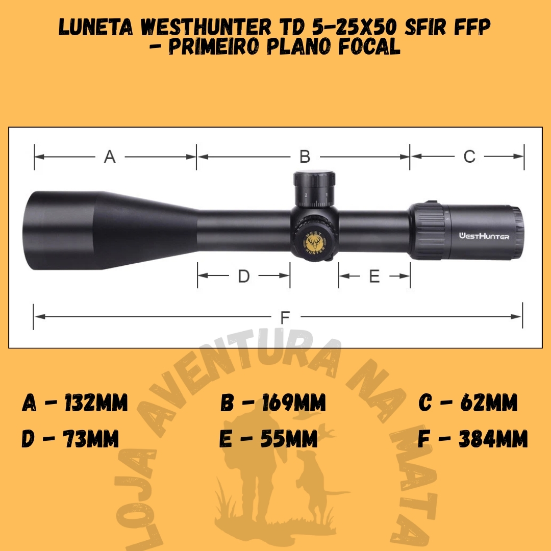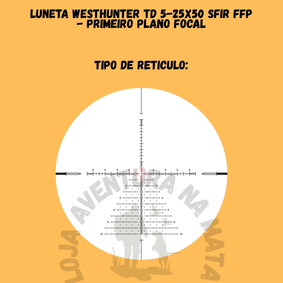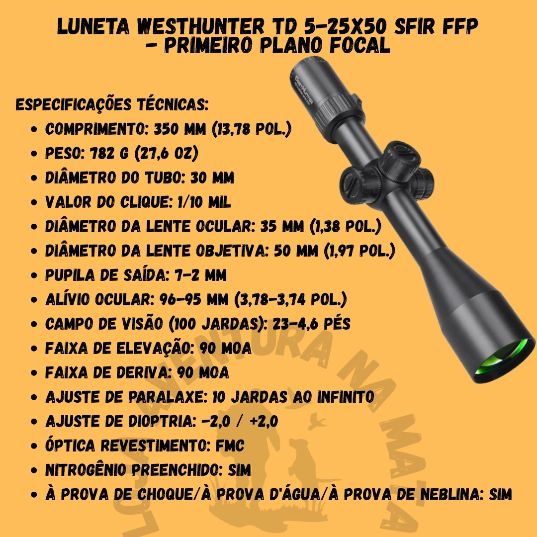 📦 Na Embalagem: 1 Luneta WESTHUNTER TD 5-25X50 SFIR FFP, tampas protetoras de lente, manual do usuário.