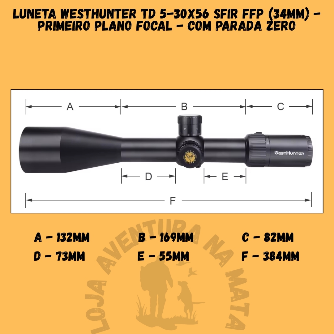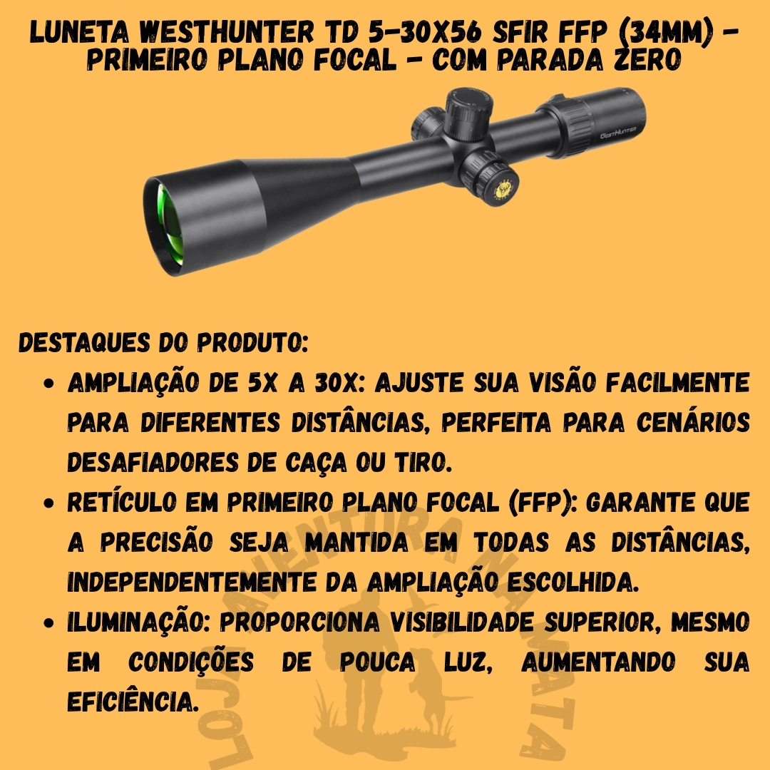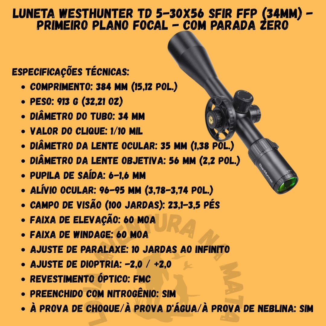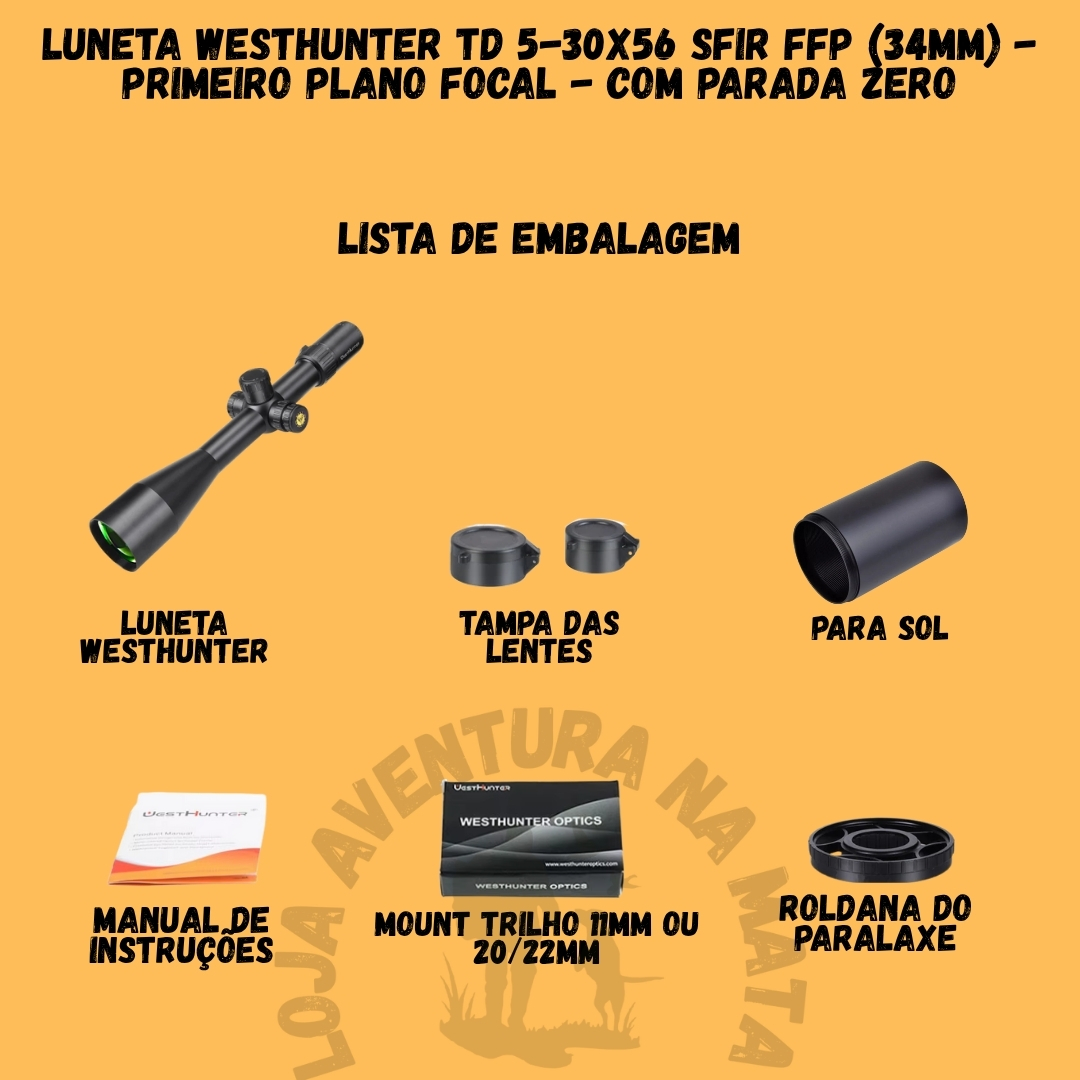 📦 Na Embalagem: 1 Luneta WESTHUNTER TD 5-30X56 SFIR FFP, tampas protetoras de lente, manual do usuário.