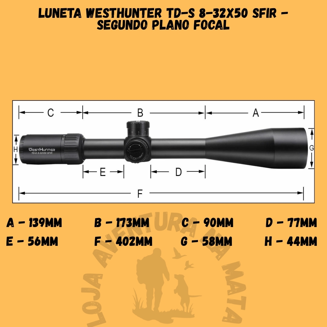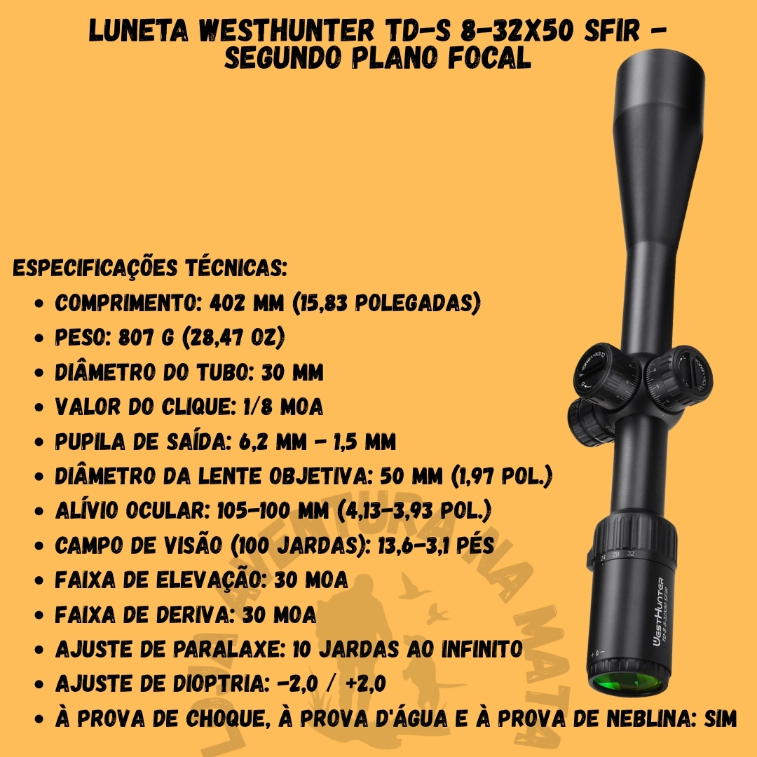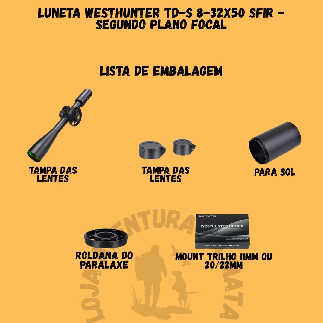 📦 Na Embalagem: 1 Luneta WESTHUNTER TD-S 8-32X50 SFIR, tampas protetoras de lente, manual do usuário.