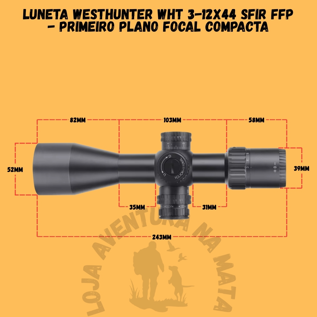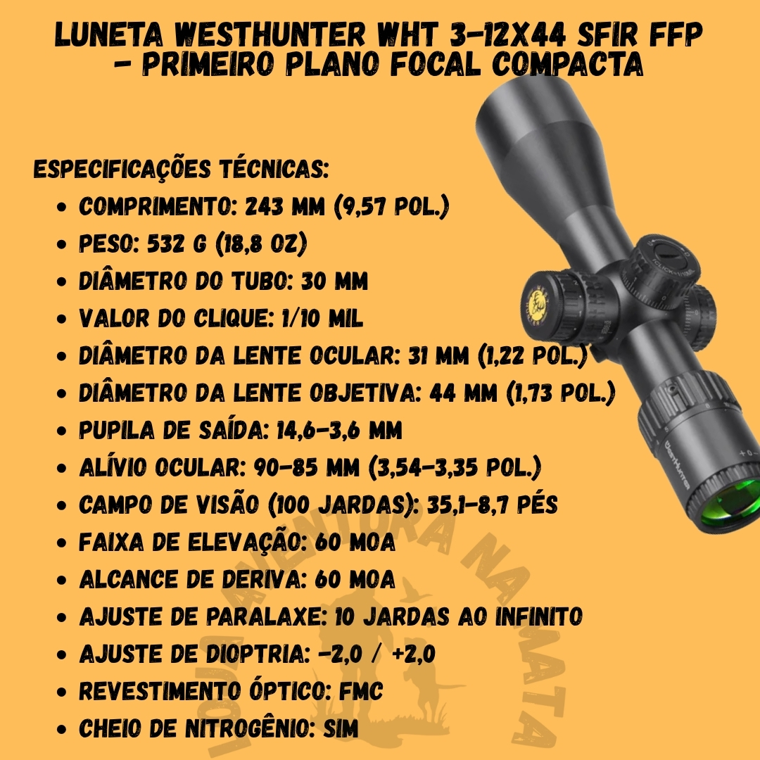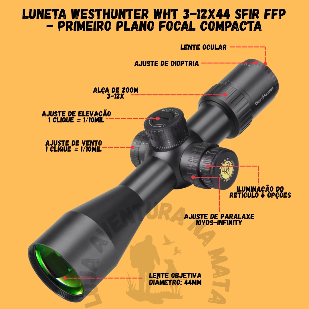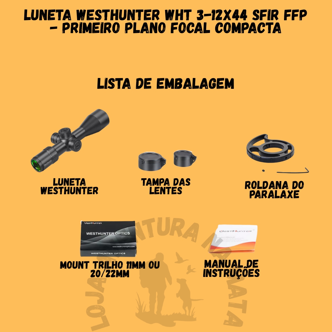 📦 Na Embalagem: 1 Luneta WESTHUNTER WHT 3-12X44 SFIR, tampas protetoras de lente, manual do usuário.