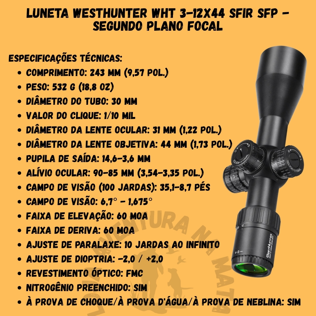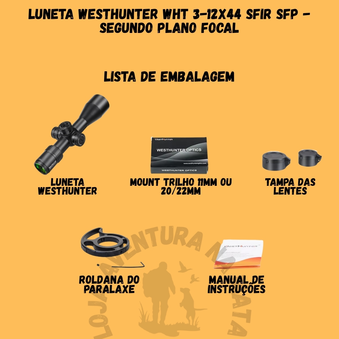 📦 Na Embalagem: 1 Luneta WestHunter WHT 3-12X44 SFIR SFP, tampas protetoras de lente, manual do usuário.