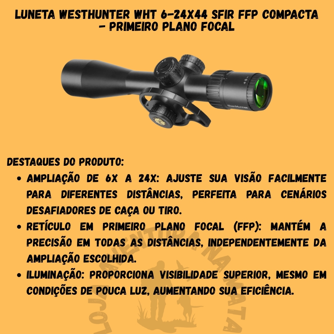 🎯 Luneta WESTHUNTER WHT 6-24X44 SFIR FFP Compacta - Primeiro Plano Focal: A luneta perfeita para caçadores e atiradores que buscam precisão e versatilidade em cada disparo! Com uma impressionante ampliação de 6x a 24x, esta luneta é ideal para diversas situações, garantindo clareza e precisão excepcionais.