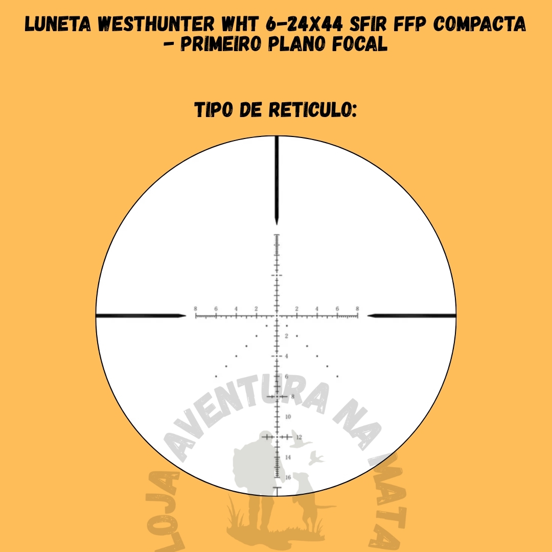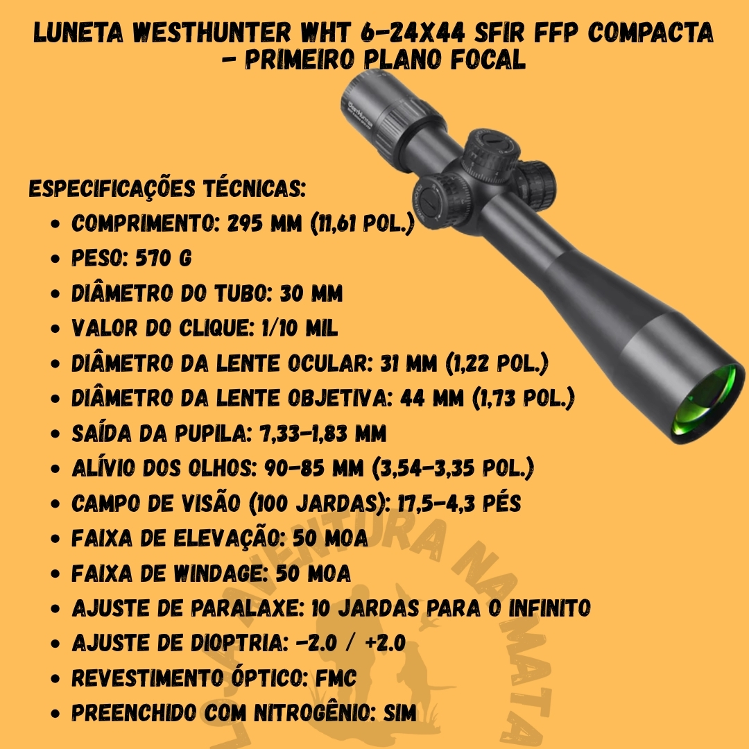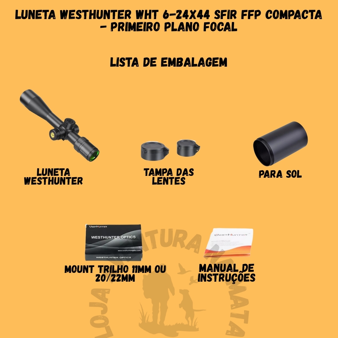 📦 Na Embalagem: 1 Luneta WESTHUNTER WHT 6-24X44 SFIR FFP, tampas protetoras de lente, manual do usuário.