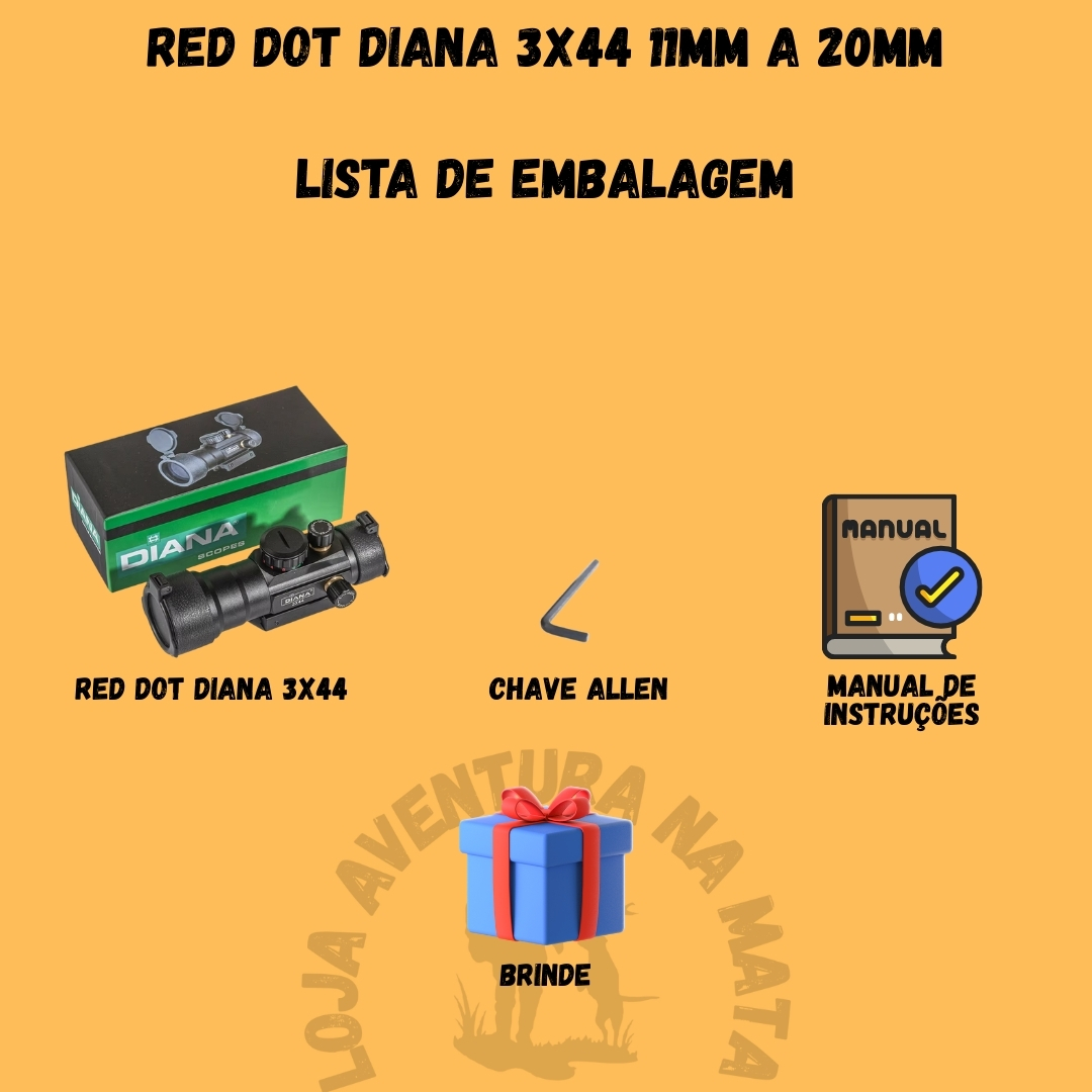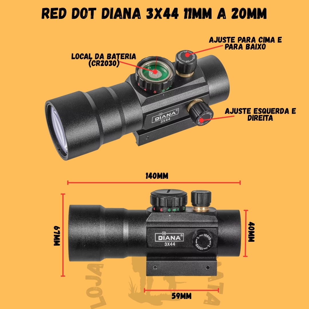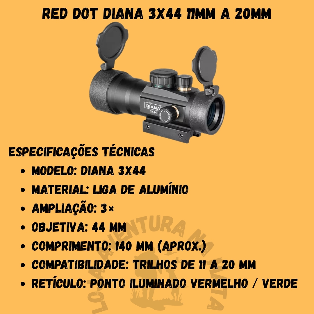 O Red Dot Diana 3X44 é um visor óptico compacto e resistente, desenvolvido para oferecer precisão, praticidade e durabilidade em diferentes situações de uso. Com retículo iluminado em vermelho ou verde, garante visibilidade clara mesmo em condições de baixa luminosidade.