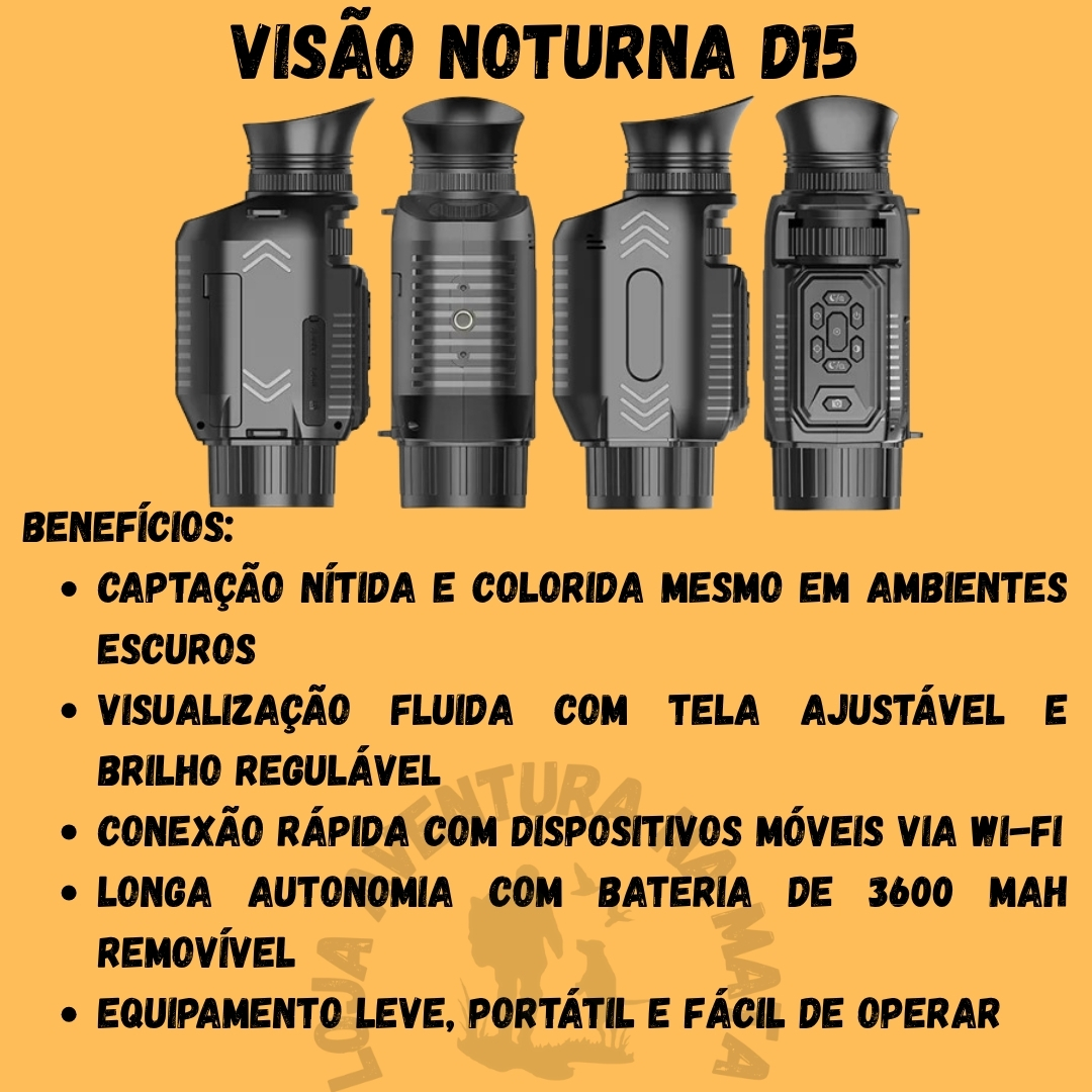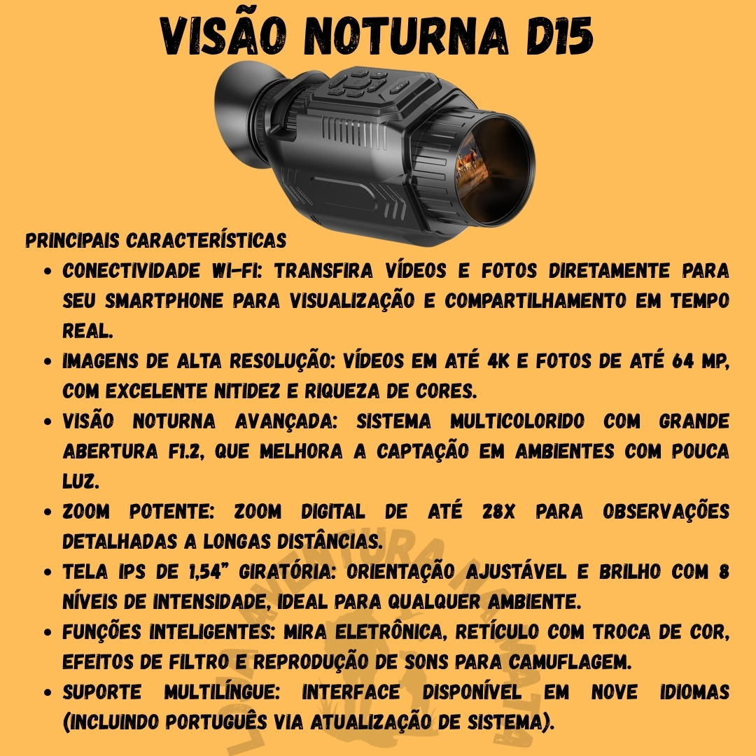 👉 A Visão Noturna D15 é perfeita para quem busca imagens nítidas, conectividade moderna e desempenho superior em baixa luminosidade, reunindo tecnologia e praticidade em um único dispositivo.