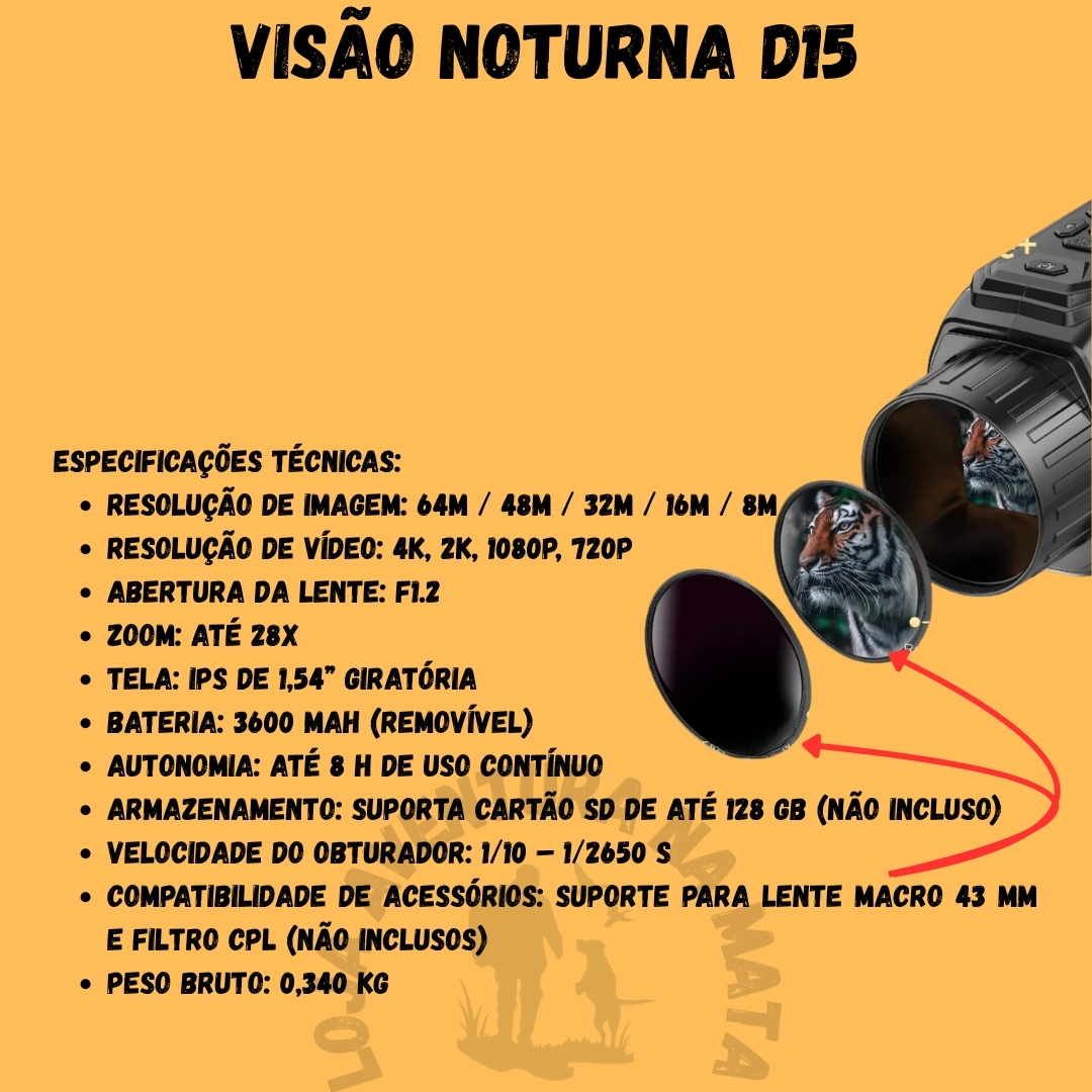 A Visão Noturna D15 combina tecnologia avançada de imagem e conectividade moderna em um equipamento compacto e versátil. Ideal para capturar vídeos e fotos com alta definição em qualquer condição de luz, oferece resolução 4K, modo de visão noturna multicolorida e zoom de até 28x, garantindo detalhes nítidos tanto de dia quanto à noite.