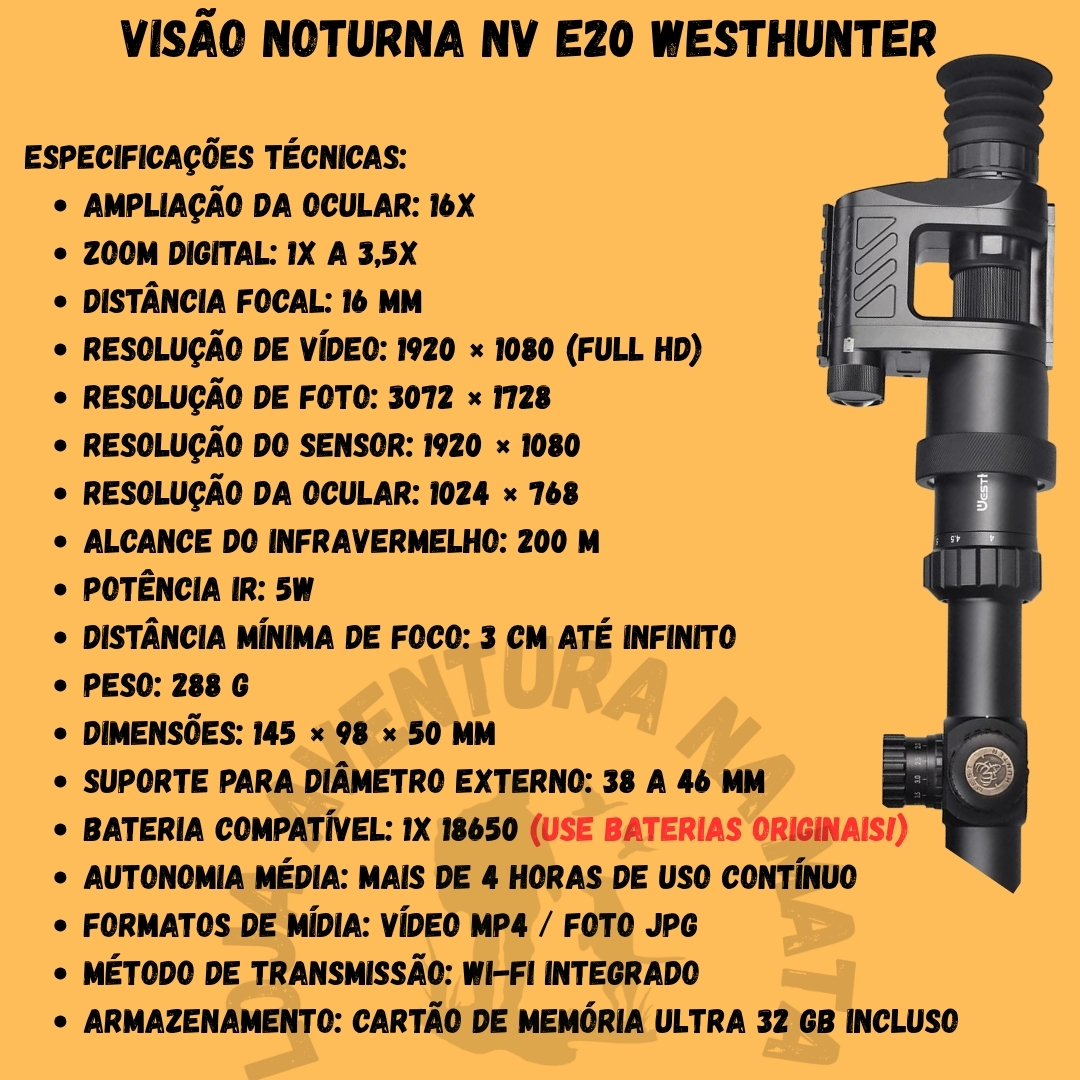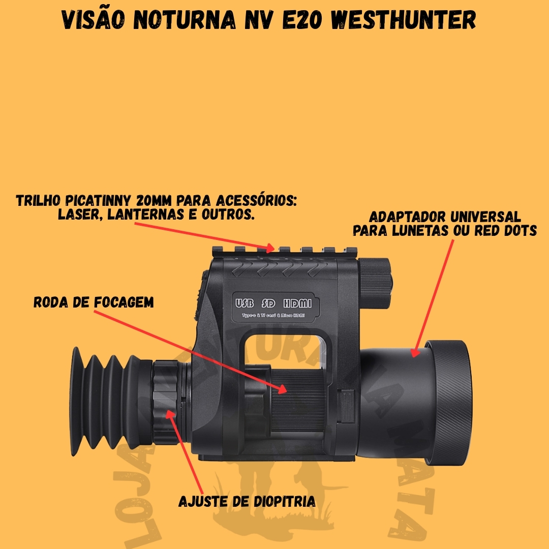 A WestHunter NV E20 é uma luneta digital de visão noturna compacta, robusta e multifuncional, projetada para uso em condições de baixa luminosidade. Com alcance de até 600 metros e 200 metros em total escuridão, zoom ajustável e sistema infravermelho IR 850nm, entrega desempenho superior tanto para observação quanto para monitoramento. Seu design modular e compatibilidade universal permitem acoplamento em diferentes equipamentos, tornando-a uma solução versátil e confiável.